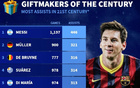 本世纪俱乐部+国家队助攻榜单:梅西446次第1,C罗305次第6